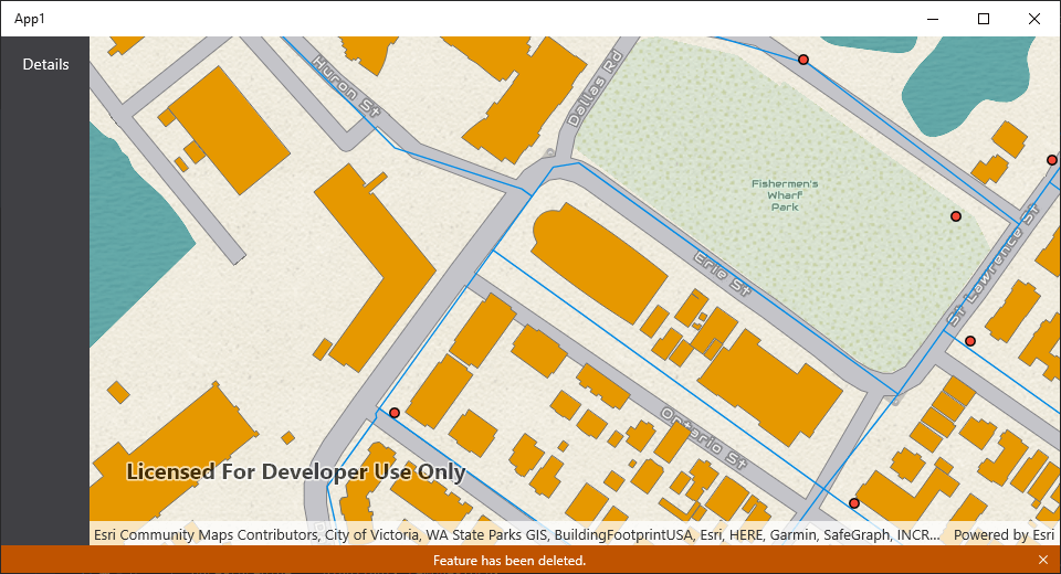 Next, configure the onFeatureDetails property of the feature details component to replicate the default behavior. You can test this behavior out by deleting a fire hydrant feature from the map.